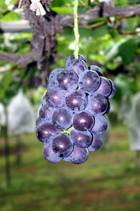 | 露地(簡易雨除被覆)のジベレリン処理1回目。ジベレリン処理は種無し化と果粒肥大のために2度行います。 |
